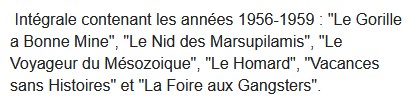 L’intégrale Spirou et Fantasio – Volume 5 : « Le Gorille a Bonne Mine », « Le Nid des Marsupilamis », « Le Voyageur du Mésozoique », « Le Homard », « Vacances sans Histoires » et « La Foire aux Gangsters », André Franquin , Niffle, 2002, 180 pages
